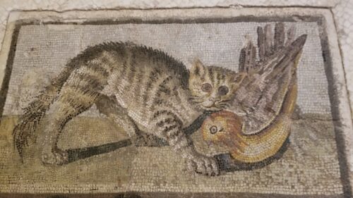Cats were probably kept more for their mousing abilities than to be pets, but they were definitely around. I’ve seen several ancient mosaics featuring cats, and also a tombstone of a child holding a cat. One mosaic shows a cat stalking birds at a birdbath, which I think shows the artist’s sense of humor. As with modern society, some homeowners obviously had a sense of humor when it came to art.