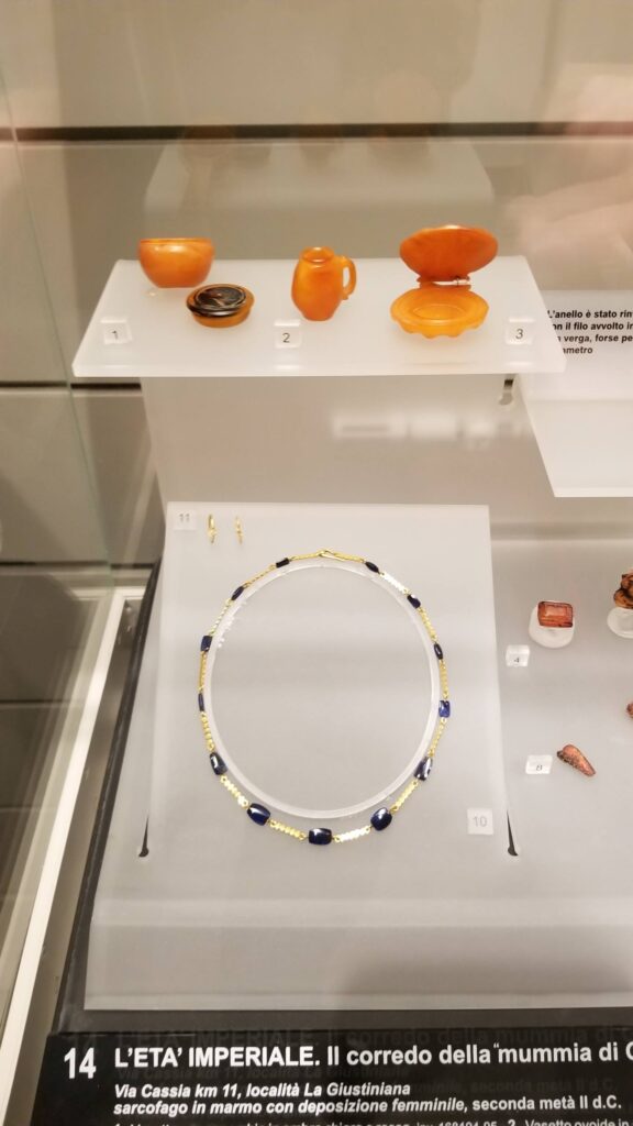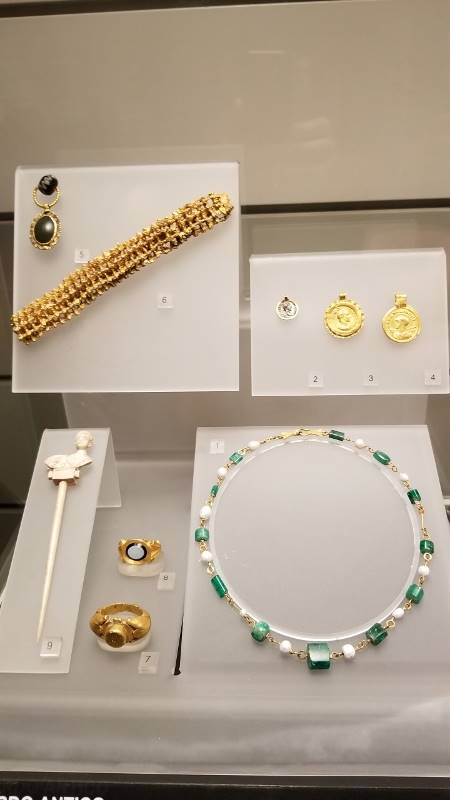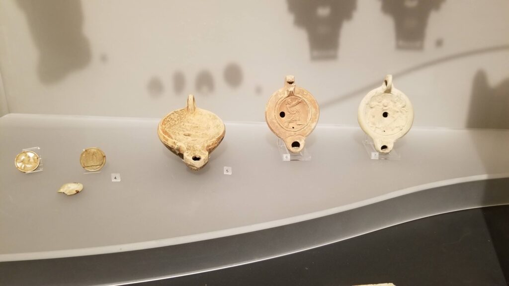 Some common household items. Clay oil lamps. Dainty cosmetic jars and examples of jewelry. The bottom photo shows tiny glass vessels that might have held perfume (or poison).