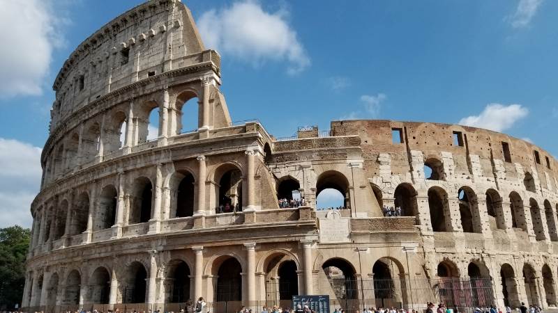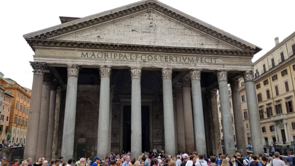 Roman cities were filled with huge buildings, such as temples, bathing complexes, theaters and arenas. Below is the Pantheon, still intact after twenty centuries. This front portico gives you scale for how large it was. And some buildings in Rome were much bigger than this.