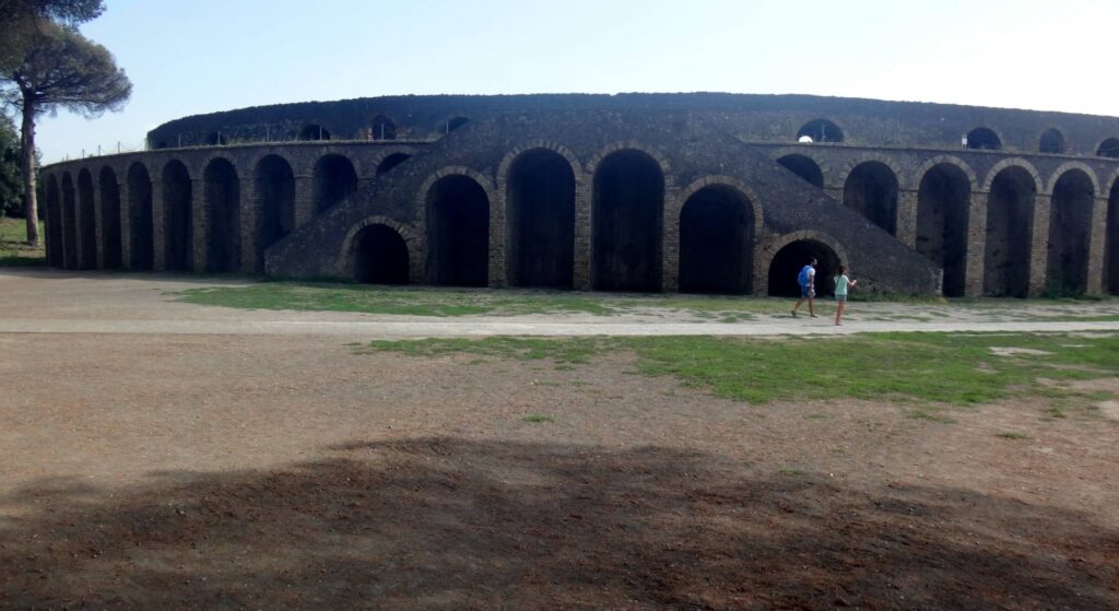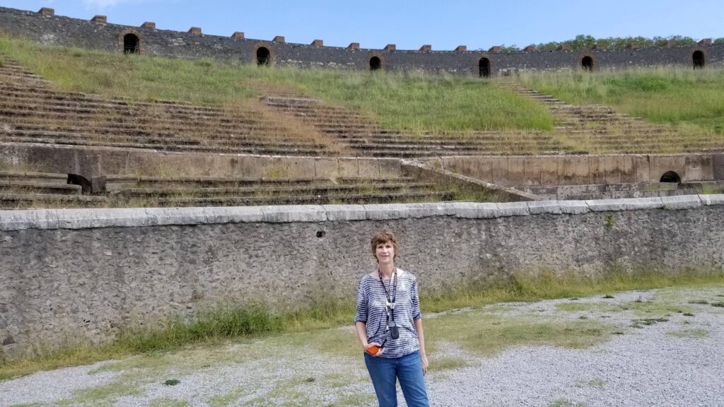 Rome wasn’t the only city with huge buildings. This is the arena at Pompeii. It’s smaller than the Colosseum, but it’s more intact. Also, unlike the Colosseum, this arena did exist when Livia’s stories take place. Exterior and interior views.
