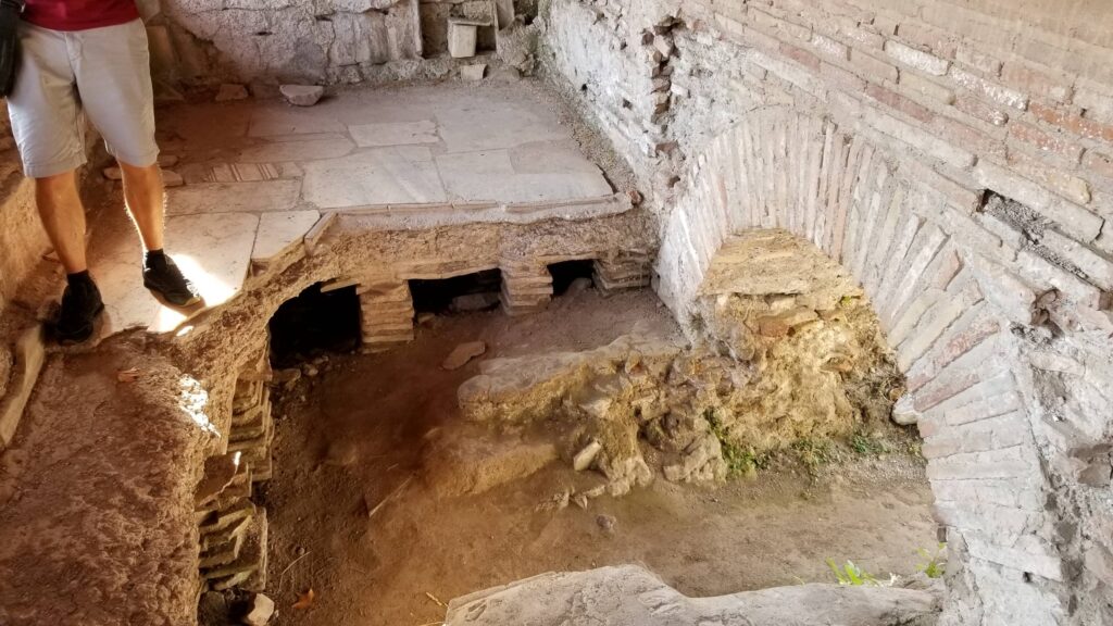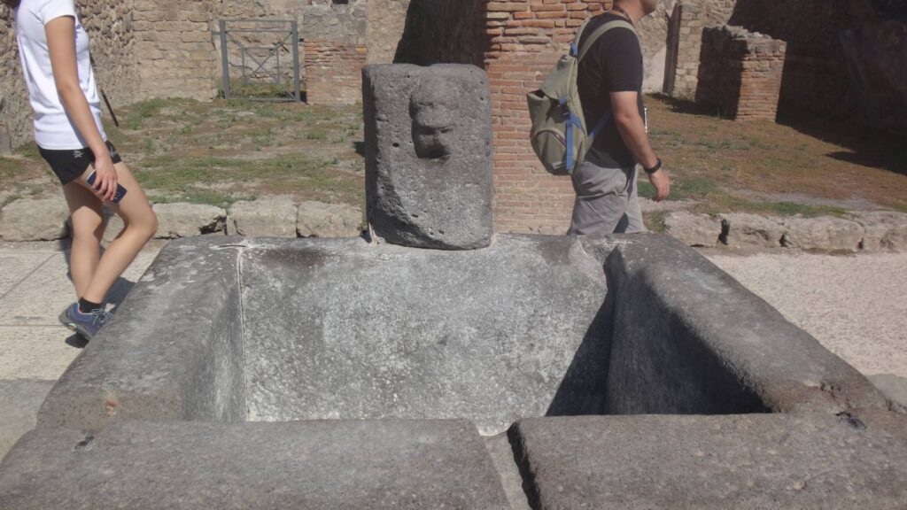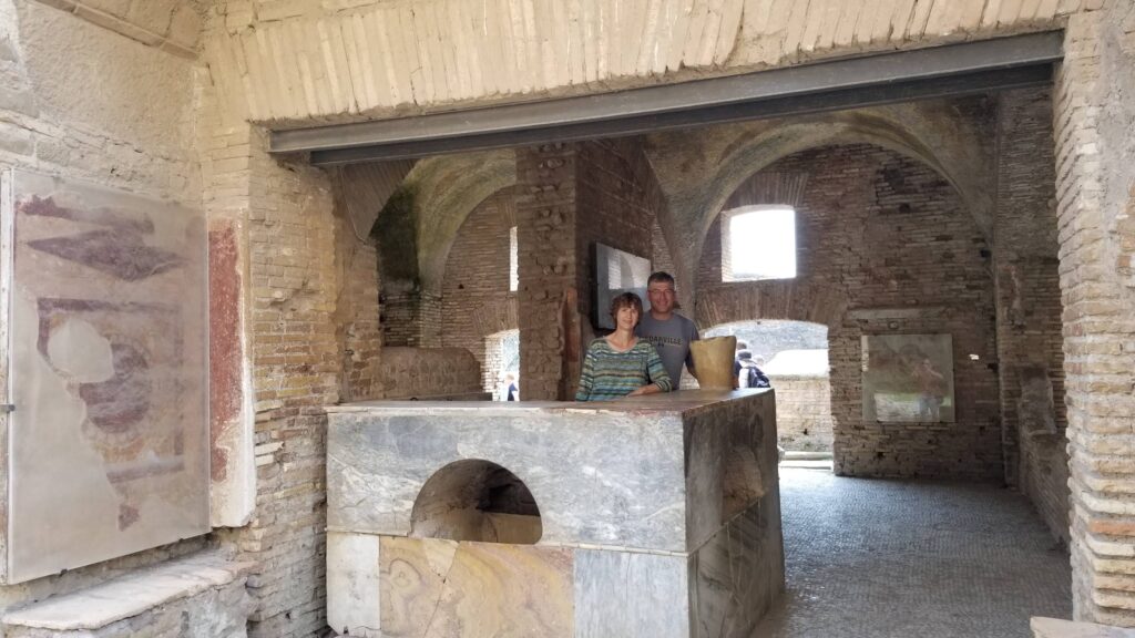 Here we are behind the counter of a restaurant. We saw many marble-clad counters like this with circular recesses for holding pots of stew or soup. Most residents of Rome lived in cramped apartments with no cooking facilities, so they were forced to rely on restaurants or street vendors for cooked food.