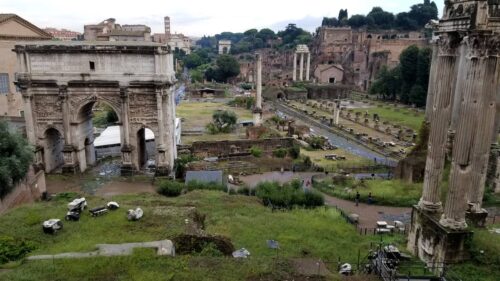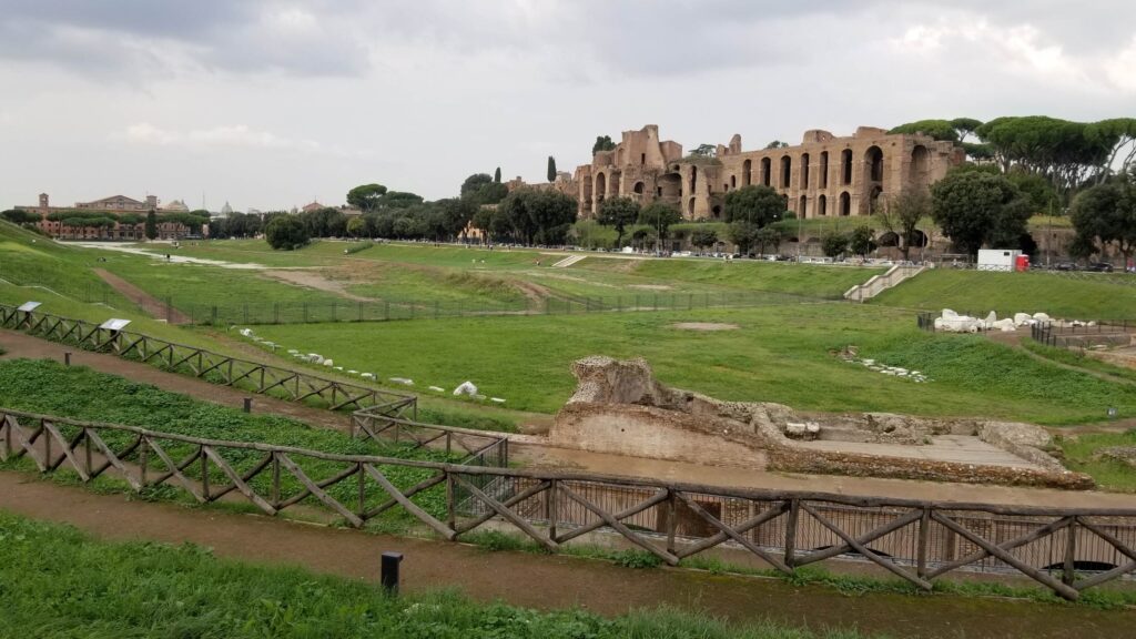 Three other examples of monumental structures: The colosseum. (Officially called the Flavian Arena. It wasn’t built yet when Livia roamed the streets of Rome). The vast Circus Maximus where chariot races were held. This view looks at the space long-ways, you’ll have to imagine the stands running down each side. And finally, a view of the old (original) forum.