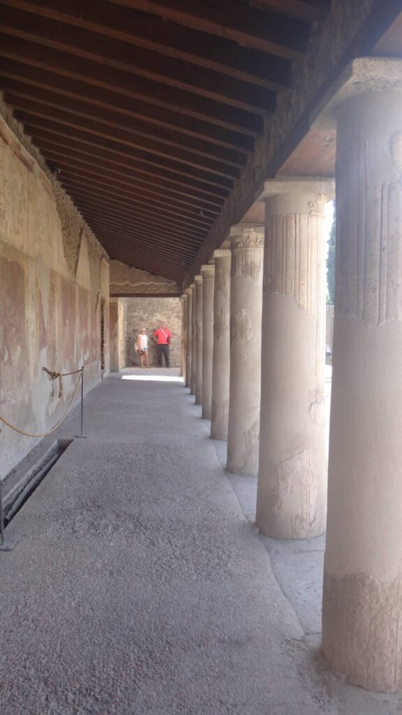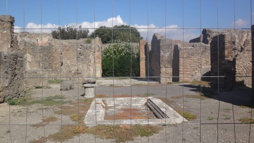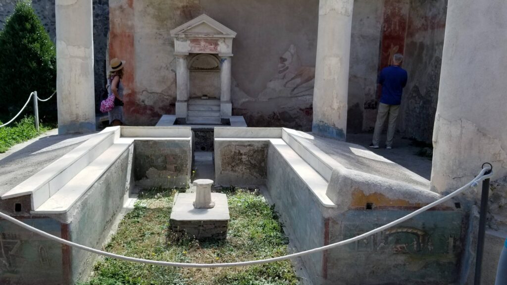 This photo shows a view through an atrium of a large house. The shallow pool in the foreground is the impluvium to catch rain water from the hole in the atrium roof above it. Looking through the room, visitors could get a glimpse into the peristyle beyond.