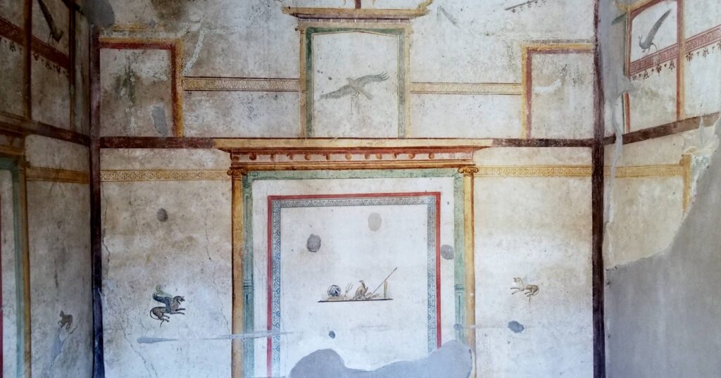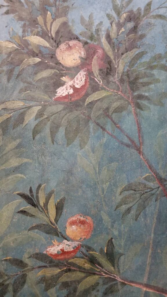 A few more details: A colonnade bordering a peristyle. A detail of a realistic garden-scene fresco. An impressive mosaic floor.
