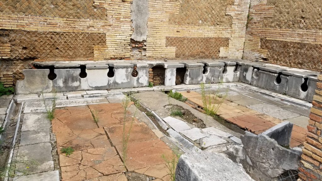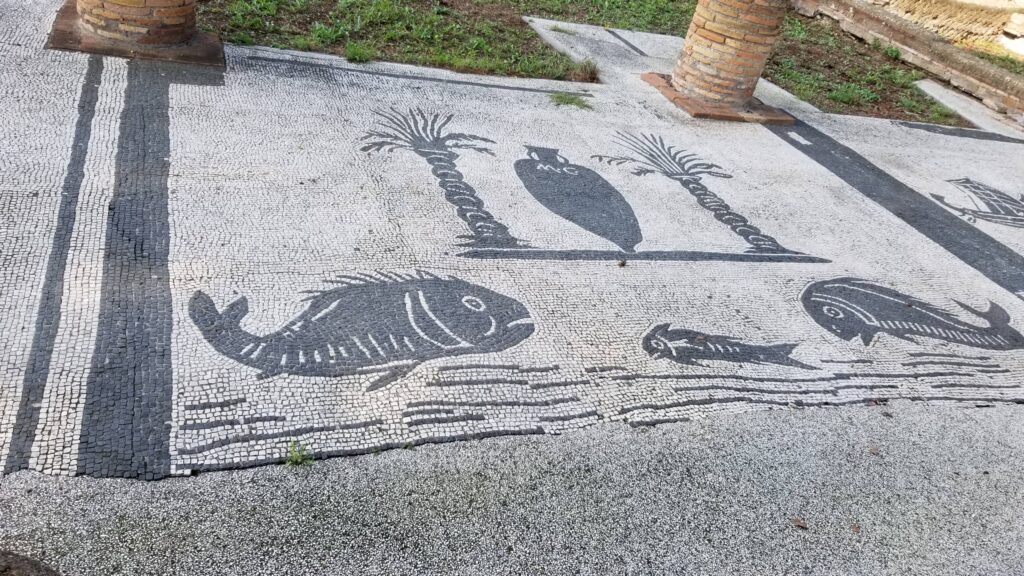 A large public toilet room. As you can see, there was no privacy. And a mosaic from the Square of the Guilds. These mosaics in this large square located in the port city of Ostia represent various businesses. The one pictured may indicate an importer of garum (fermented fish sauce).