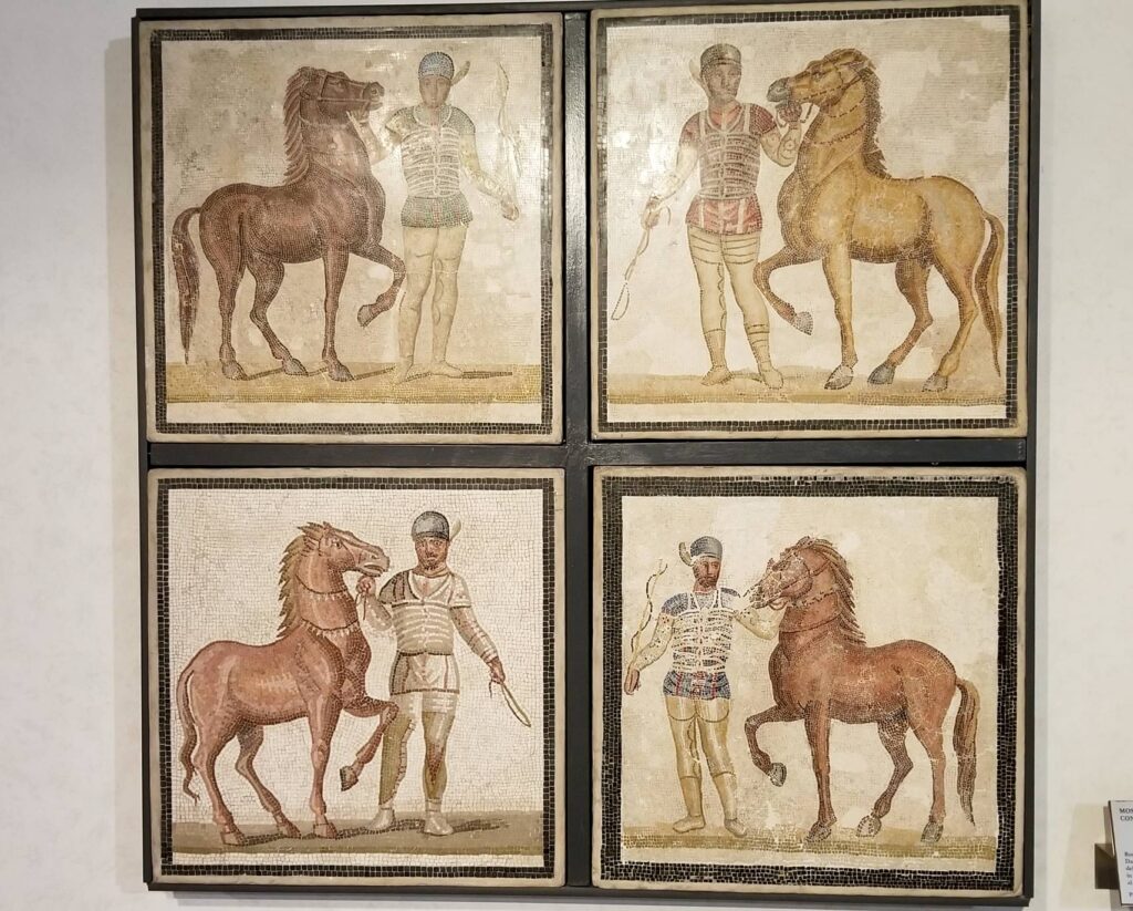 The photo below shows a floor raised on brick pilings. When a fire was kept in the space underneath, it warmed the floor. This detail is from a public bath complex in Ostia. And finally, a mosaic depicting the four chariot racing teams—the Greens, Reds, Whites and Blues. Romans were as fanatical about their favorite team as football fans are today. (And you found the same four teams across the empire.)