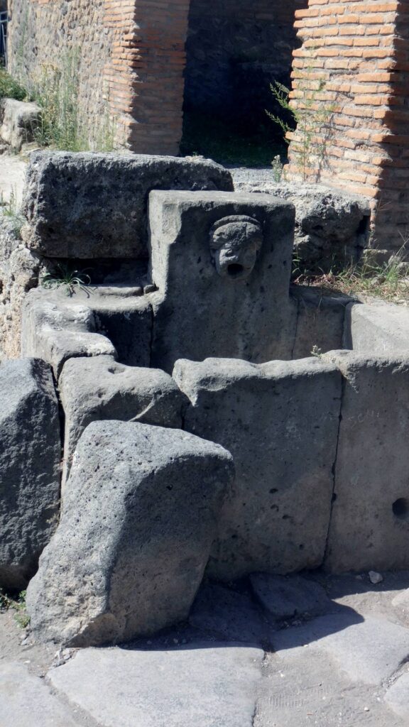The Roman water supply: A lead water-pipe, still embedded in the ground. And two views of public fountains located in street intersections. These are from Pompeii, but Rome had hundreds of similar fountains. They were the primary water source for most residents of the city.