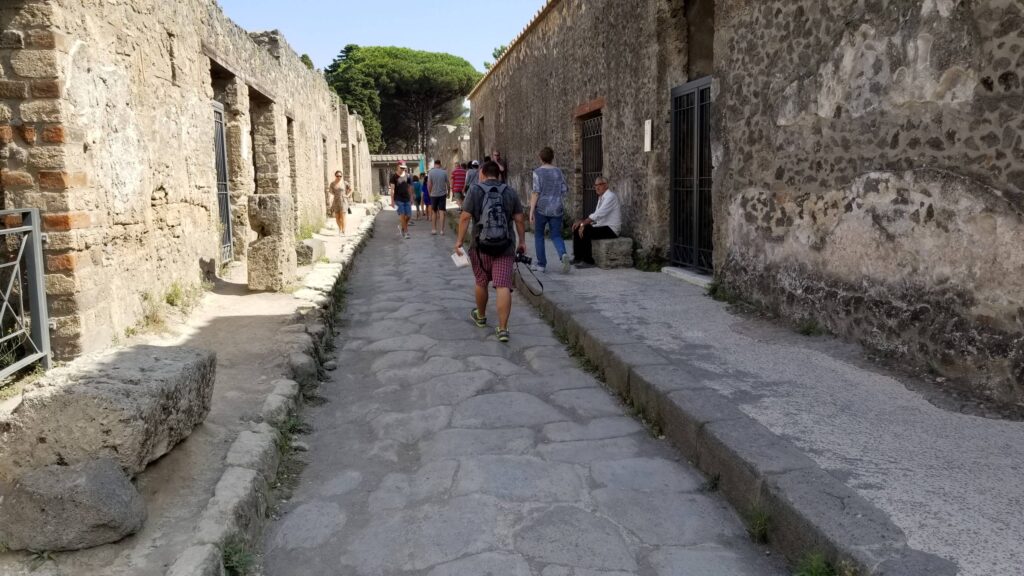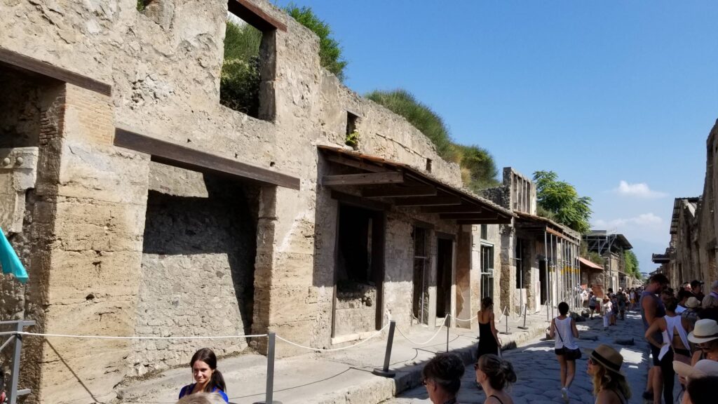 Some streets in Pompeii. Notice how the ruins are only the first floor of what were once multi-story buildings. Typically, shops would line the street with apartments in the floors above.